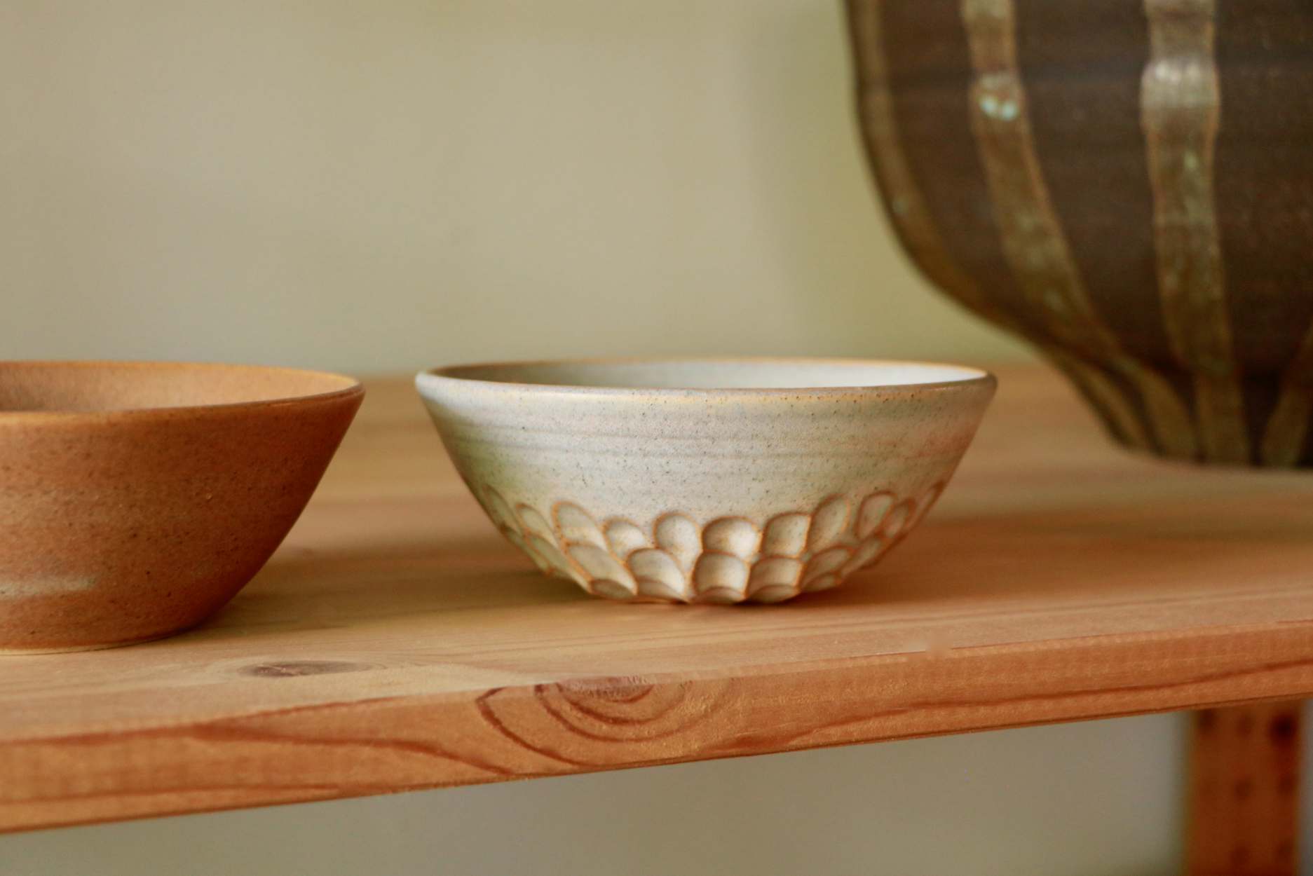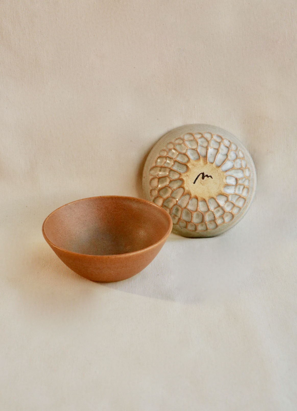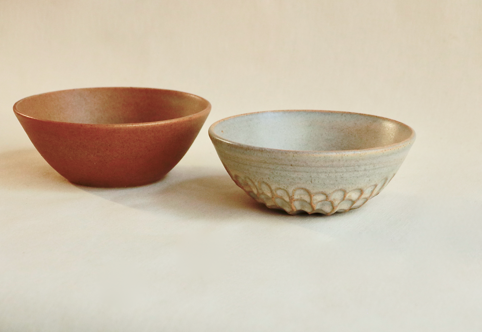 Juego de cuencos realizados en torno de gres de alta temperatura. Decorados con esmaltes satinados caramelo y crema irisado. Texturas con facetados. Cocido a 1250ºC